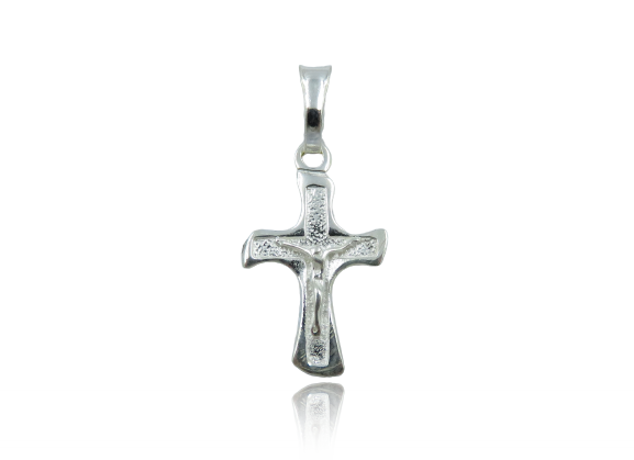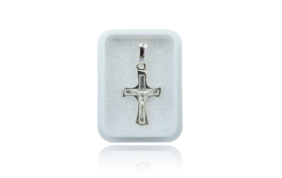 Srebrny krzyżyk z wizerunkiem Jezusa, wykonany ze srebra próby 925, umieszczony w pudełeczku.