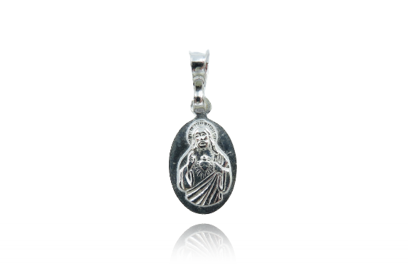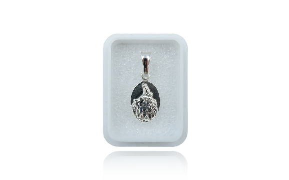Srebrny medalik z wizerunkiem Matki Bożej Szkaplerznej i Serca Jezusa, wykonany ze srebra próby 925, umieszczony w pudełeczku.