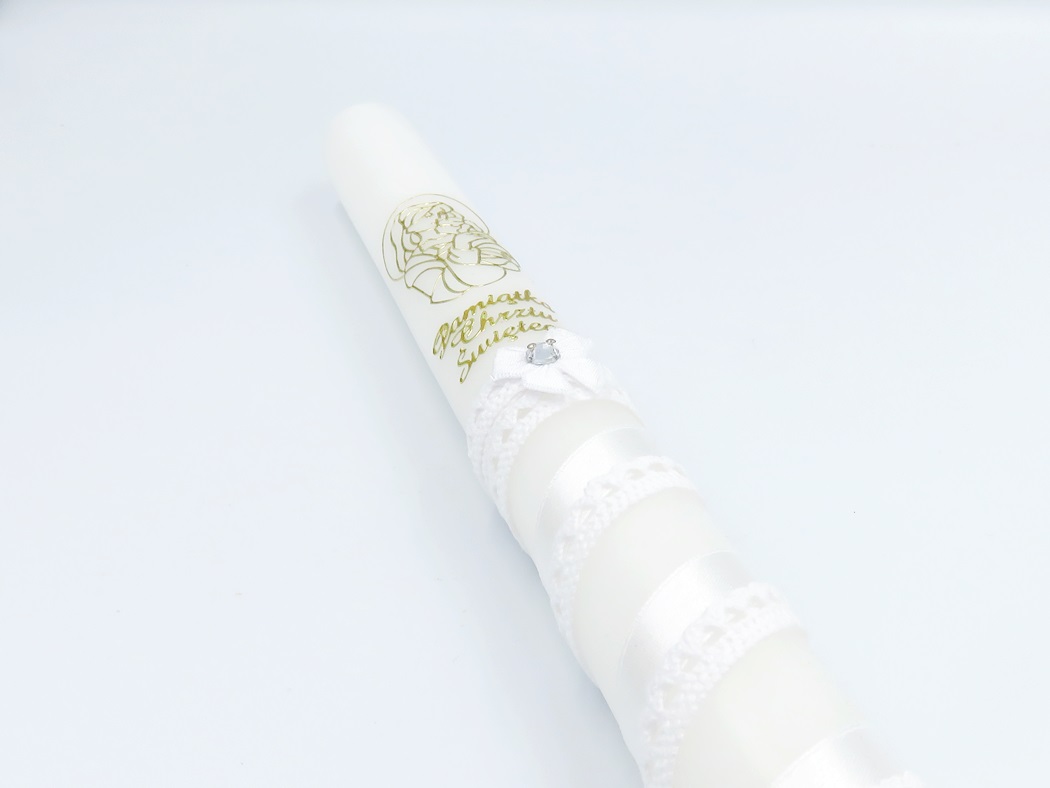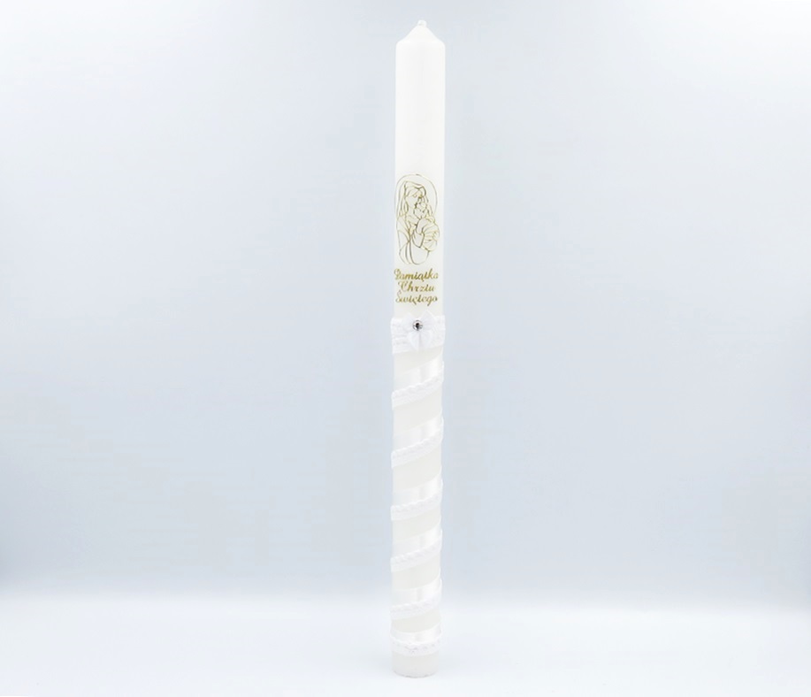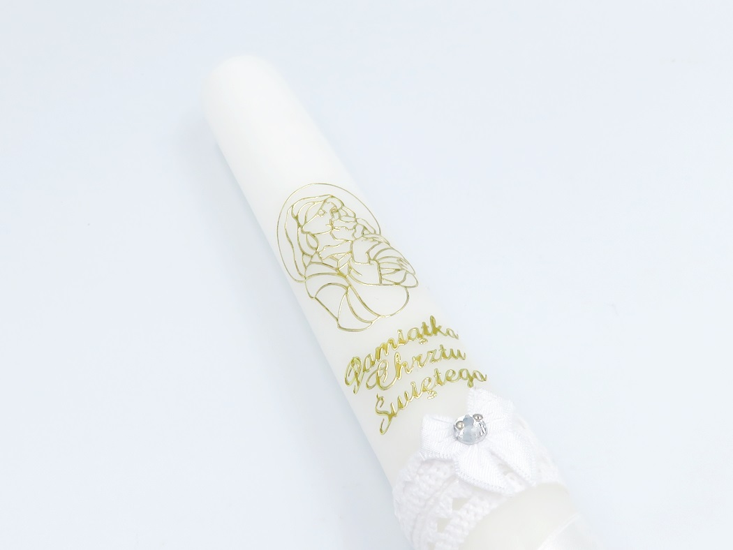 Świeca parafinowa na Chrzest Święty z wizerunkiem Matki Bożej z Dzieciątkiem.