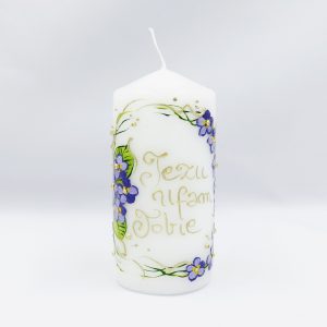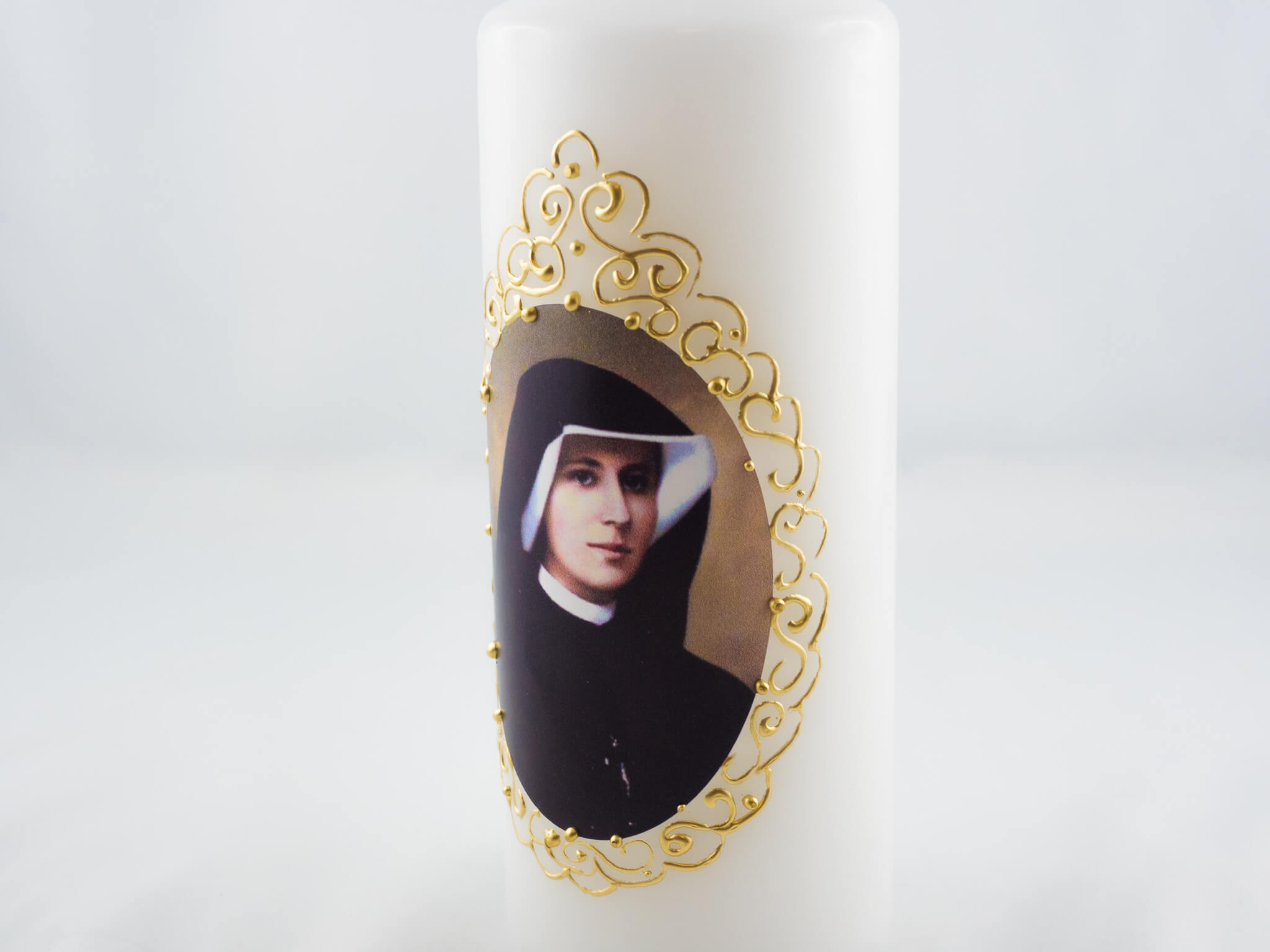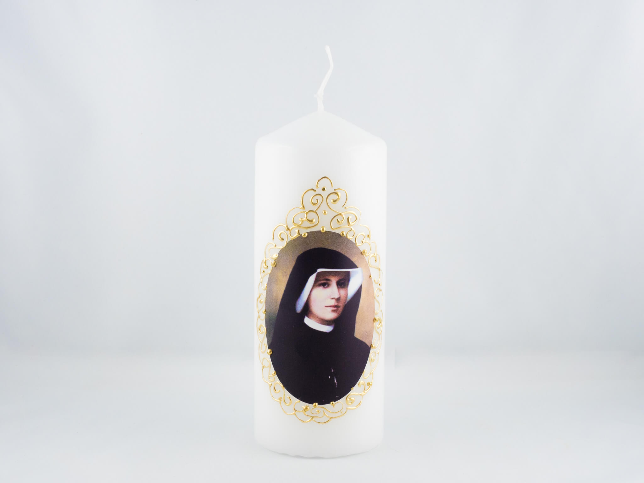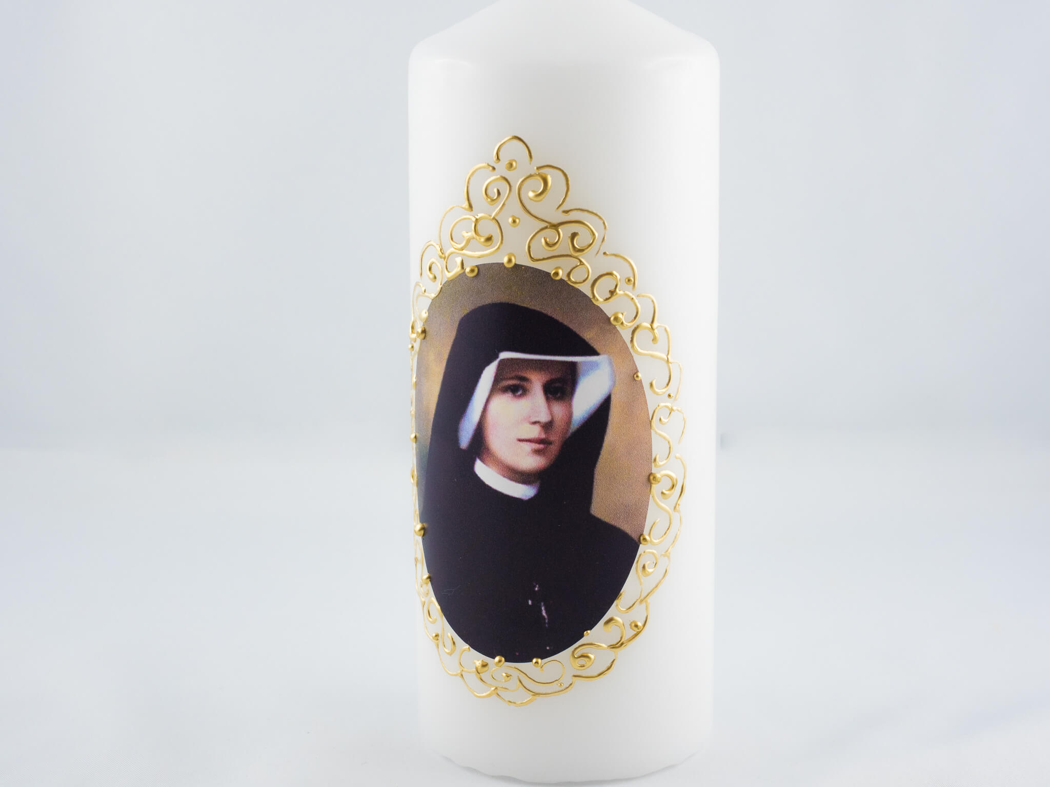 Świeca z wizerunkiem św. Siostry Faustyny, ręcznie malowana, lakierowana, następnie złocona płynną parafiną.