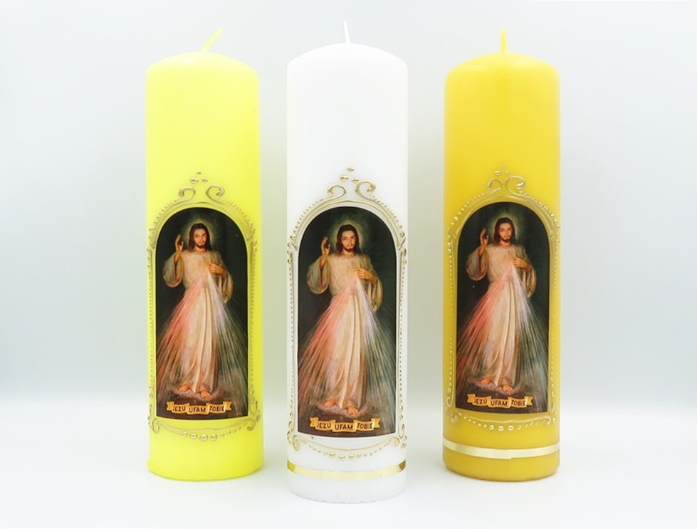 Świeca ołtarzowa z ozdobną naklejką Jezusa Miłosiernego, ręcznie malowana, lakierowana, następnie złocona płynną parafiną.