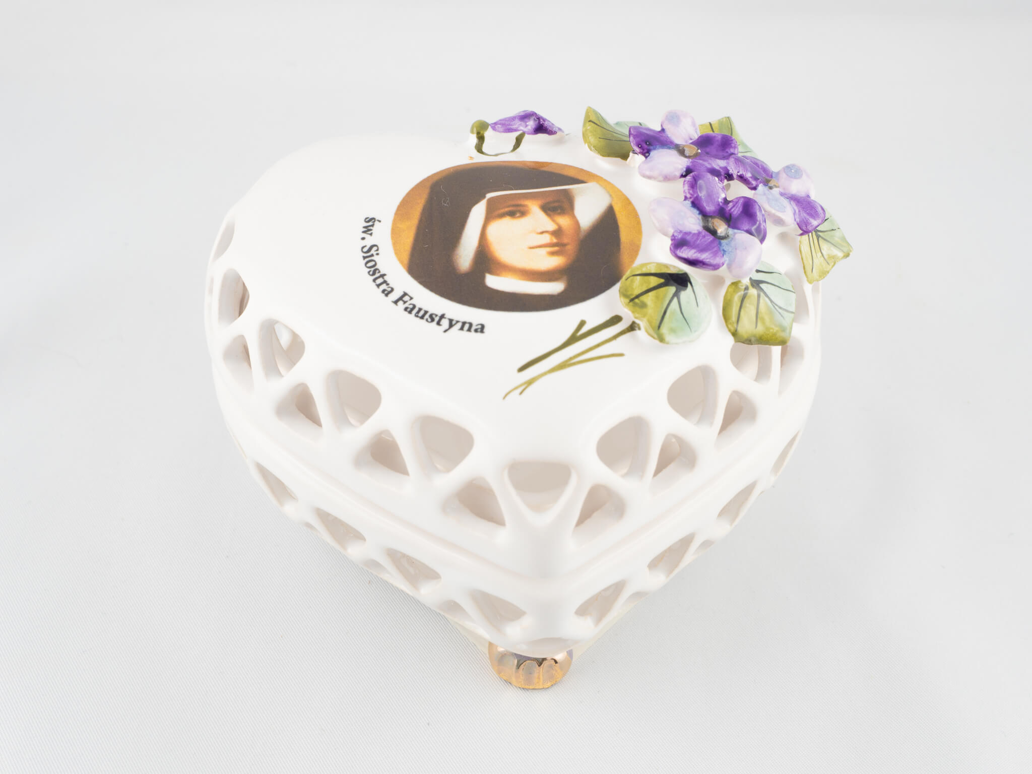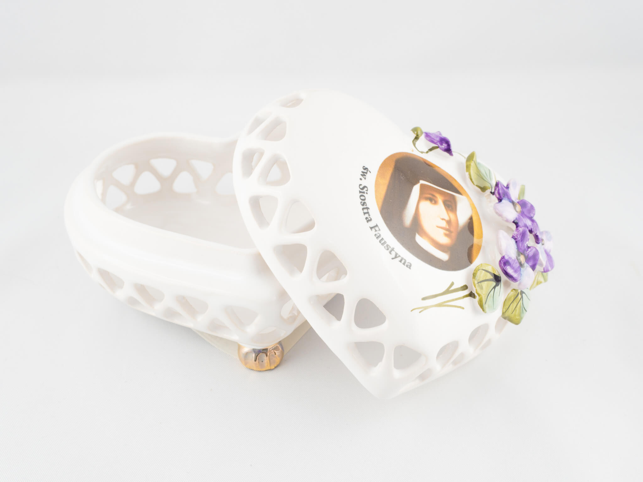 Ceramiczna szkatułka ze zdjęciem św. Siostry Faustyny i fiołkami. Złocona, malowana ręcznie farbami najwyższej jakości, wypalana w bardzo wysokich temperaturach.