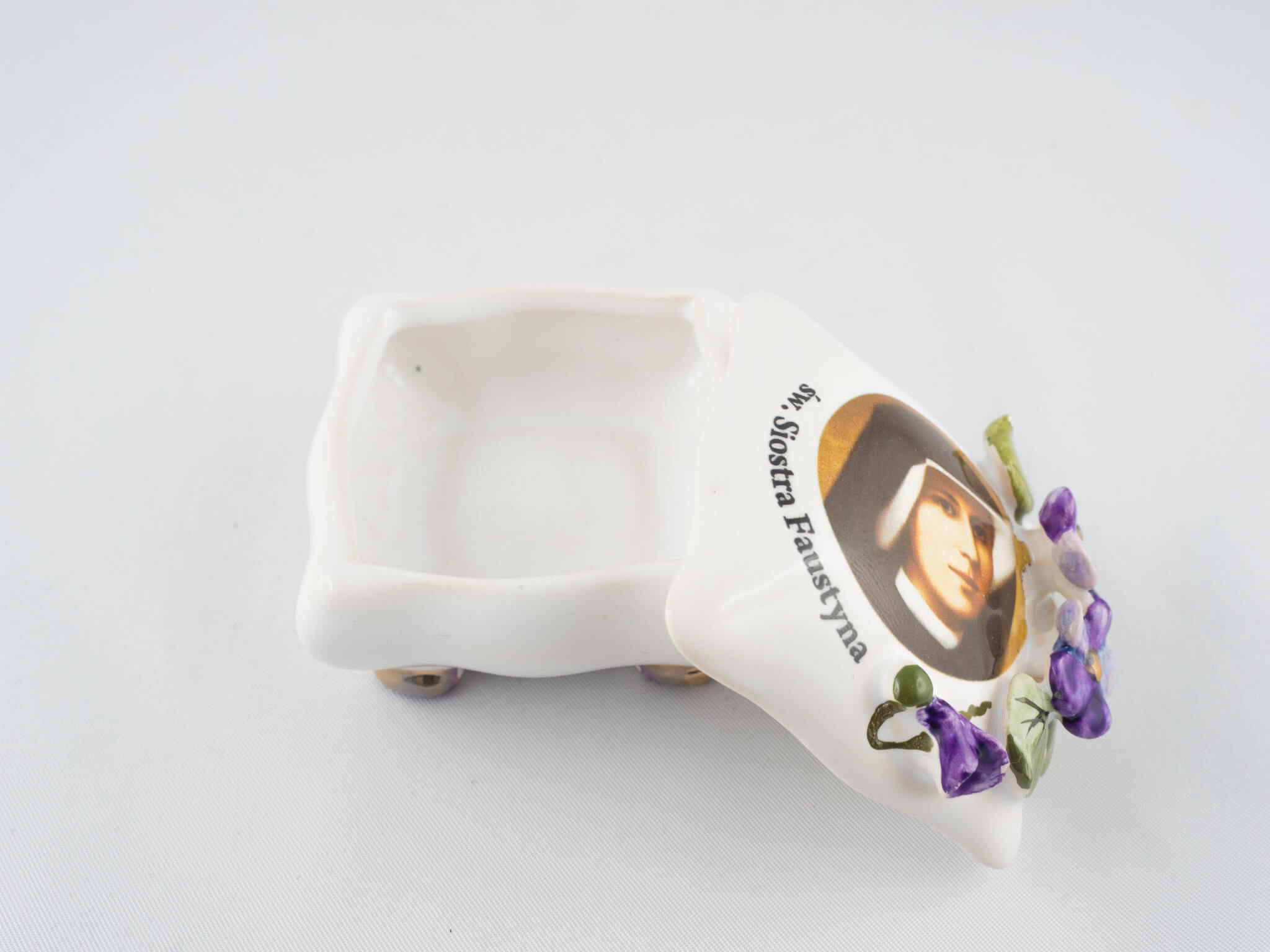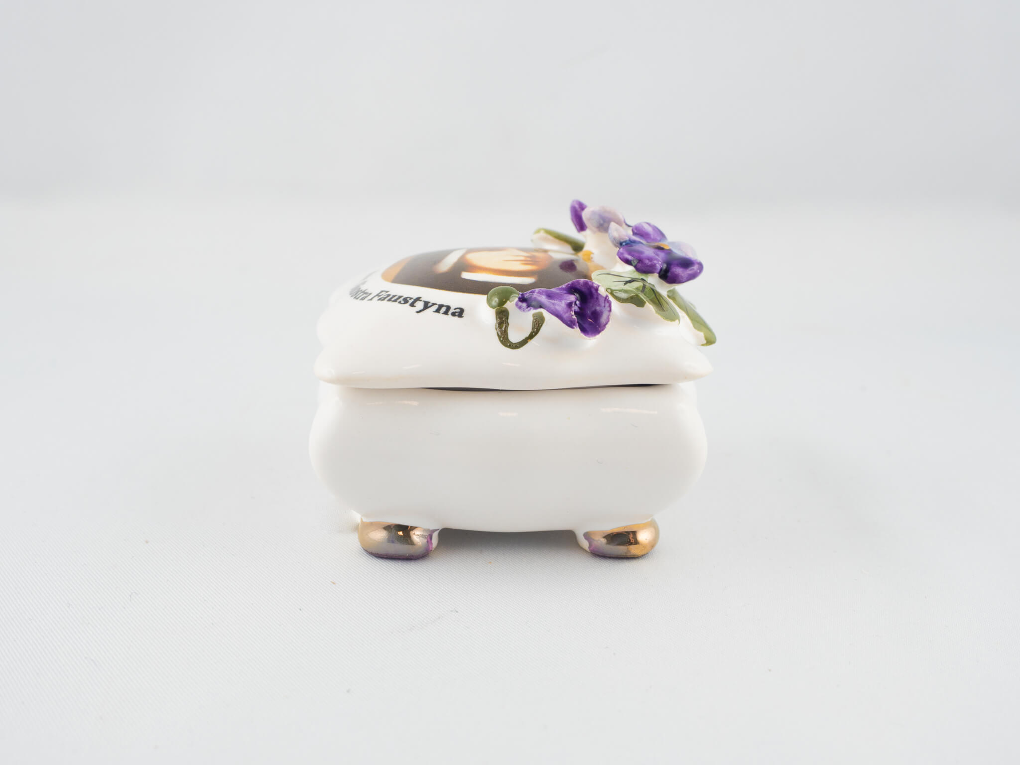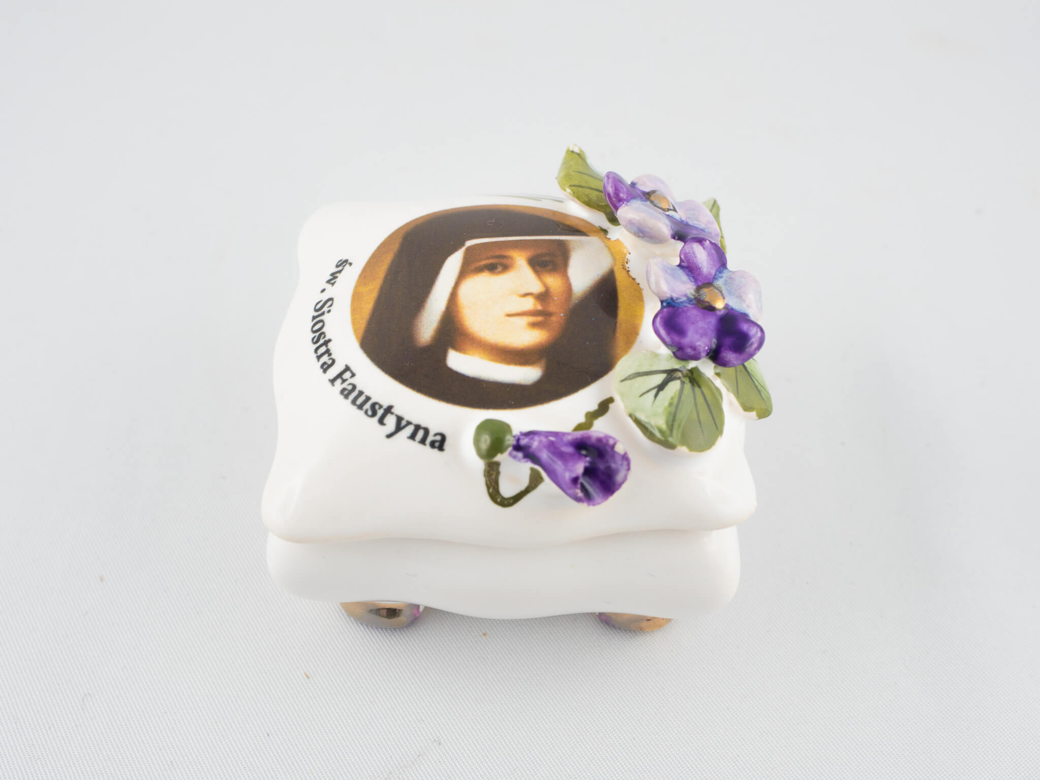 Ceramiczna szkatułka ze zdjęciem św. Siostry Faustyny i fiołkami. Złocona, malowana ręcznie farbami najwyższej jakości, wypalana w bardzo wysokich temperaturach.
