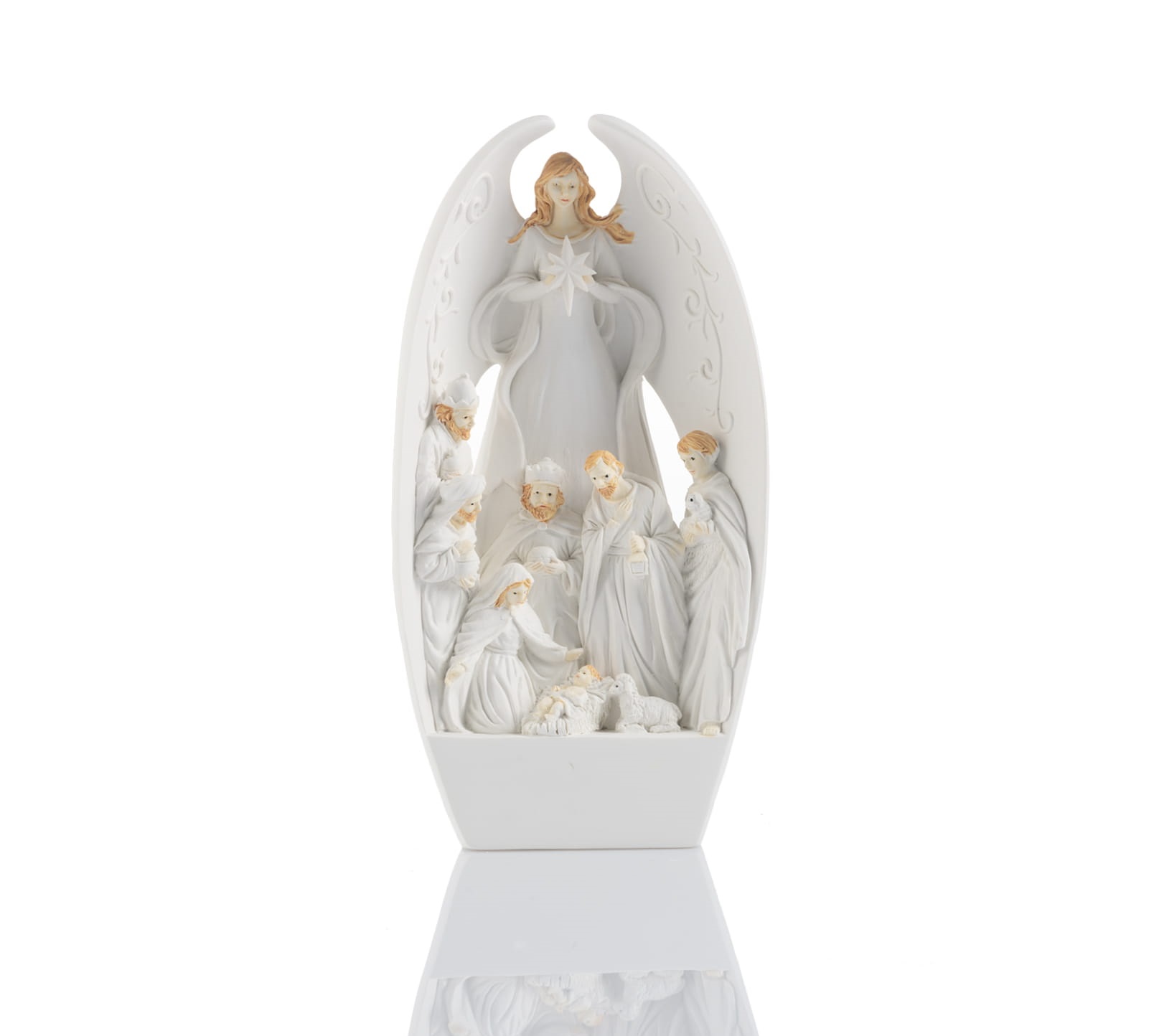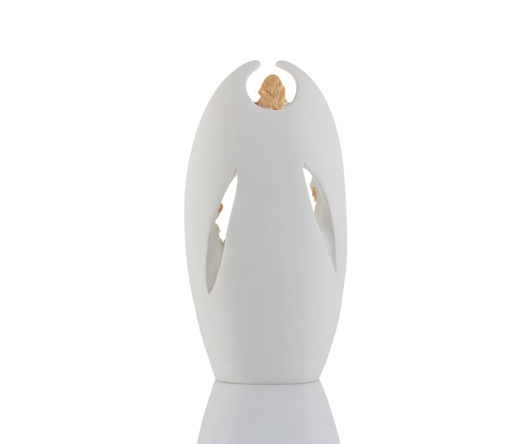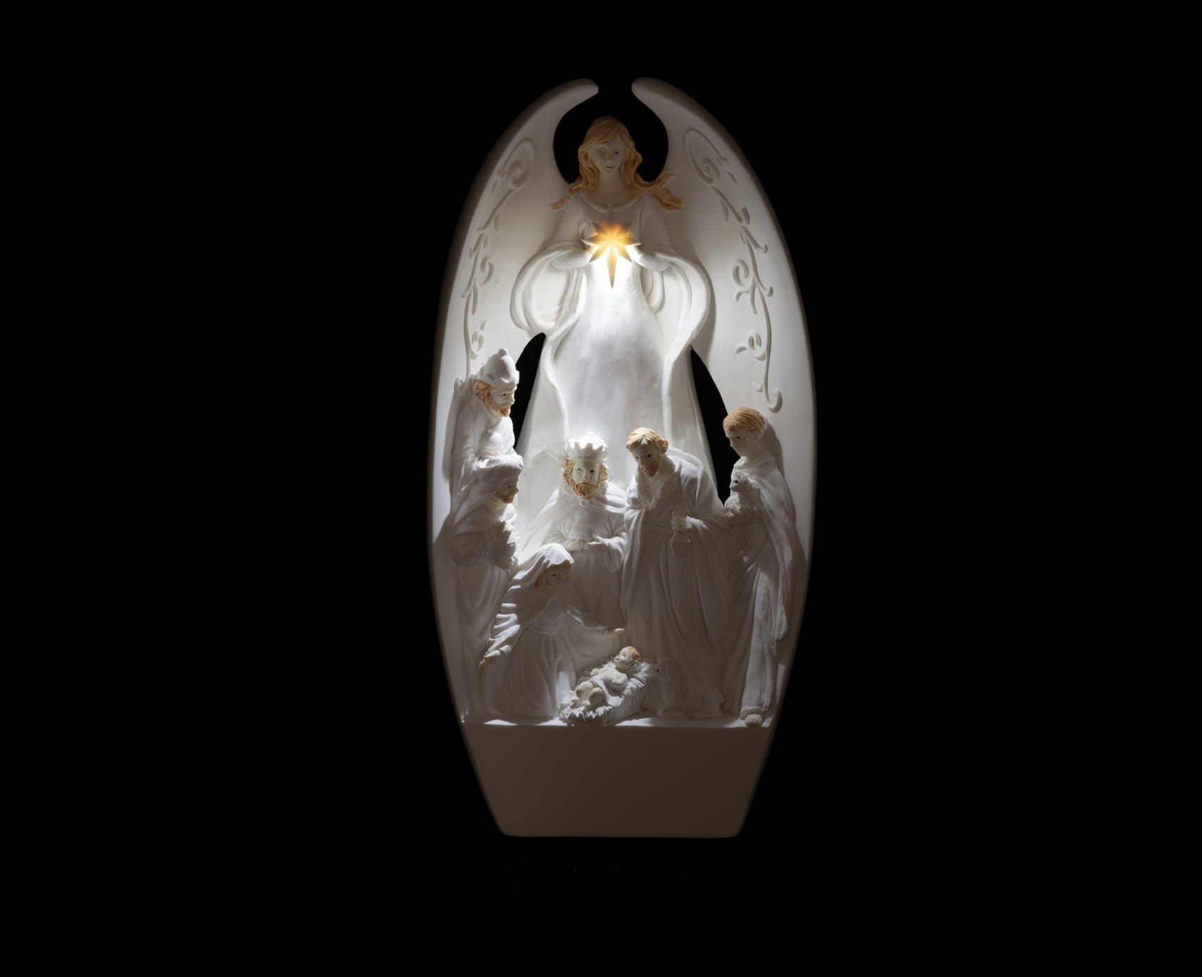 Szopka Bożonarodzeniowa w kształcie anioła opiekującego się Świętą Rodziną.