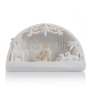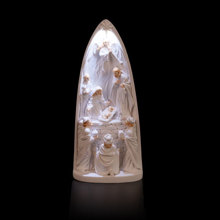 Szopka Bożonarodzeniowa wykonana z żywicy, posiada lampkę LED, która od góry oświetla postacie.