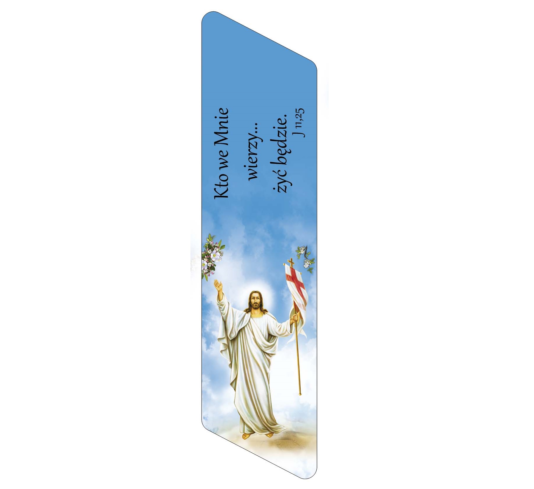 Zakładka magnetyczna do książki z wizerunkiem Jezusa Zmartwychwstałego oraz cytatem.
